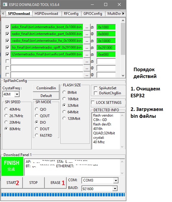Далее, потребуется утилита Flash download tools прошивка будет осуществляется при помощи ее. Важное замечание, Flash download tools необходимо разворачивать в корень диска и путь к файлам прошивки не должен содержать кириллических символов. Перед первой прошивкой необходимо воспользоваться опцией ERASE в настройках Flash download tools (см.картинку). ![]() Конфигурацию SpiFlash модуля устанавливаем согласно картинки. CrystalFreq- 40M, Spi Speed- 80MHz, Spi Mode- DIO, Flash Size- 32Mbit (зависит от применяемого модуля). Указать адреса секций согласно файлам (см.картинку): 0x1000- загрузчик, 0x8000- разметка разделов, 0x10000- прошивка, 0x291000- разметка spiff, 0xe000- калибровочные данные. Выбрать COM порт uart конвертера, установить скорость Baud 921600 и нажать кнопку Start. Если все сделано верно то должен пойти процесс прошивки. Если прошивка прошла успешно выключаем приемник, ждем 5-10сек и подаем питание если все сделано правильно приемник начнет процесс загрузки и инициализации.