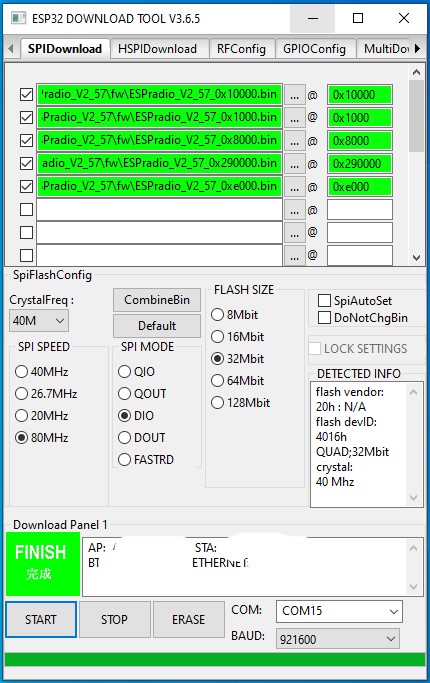 ESPradio_V2_63.zip прошивка версия 63. Тестовый вариант с поддержкой Bluetooth. Прошивать через uart. Конфигурация флешера- см.картинку в архиве