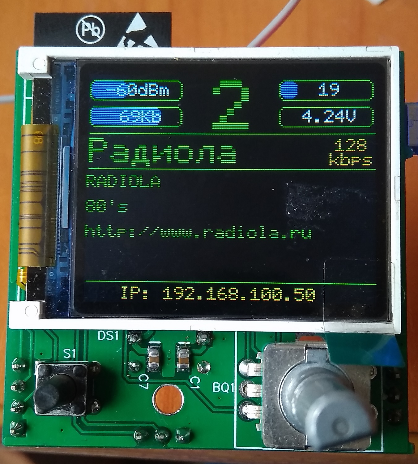 http://192.168.100.50/power -управление воспроизведением http://192.168.100.50/stream?url=http://radio.dline-media.com/r13radio -воспроизвести поток по ссылке, пример http://radio.dline-media.com/r13radio http://192.168.100.50/sound?vol=XX -установит уровень громкости, значения XX от 0 до 100 http://192.168.100.50/play?ch=XX -воспроизвести поток по номеру канала, значения XX от 0 до 99 http://192.168.100.50/urlXX?name=YY&url=WW -сохранить в ячейку XX (от 0 до 99) имя ячейки YY ссылку на поток WW